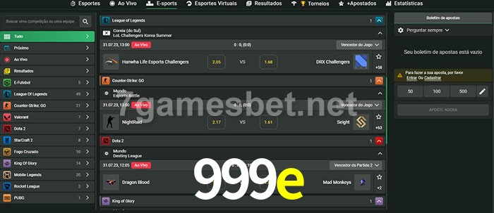 O 999e oferece uma grande seleção de opções de apostas em e-sports com probabilidades competitivas